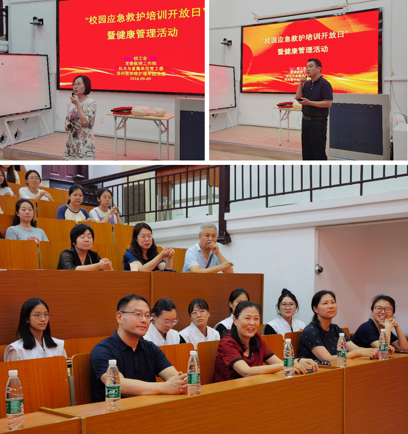 为深入学习贯彻党的二十届三中全会精神,大力弘扬教育家精神,进一步提升校园救护能力,保障教职员工身体健康,2024年9月9日下午2时,在维正楼护理学院阶梯教室,校工会、党委教师工作部、机关与直属单位党工委、苏州医学院护理学院党委联合开展校园应急救护培训开放日暨健康管理活动。活动由护理学院党委书记刘慧主持,校工会副主席顾志勇致辞。