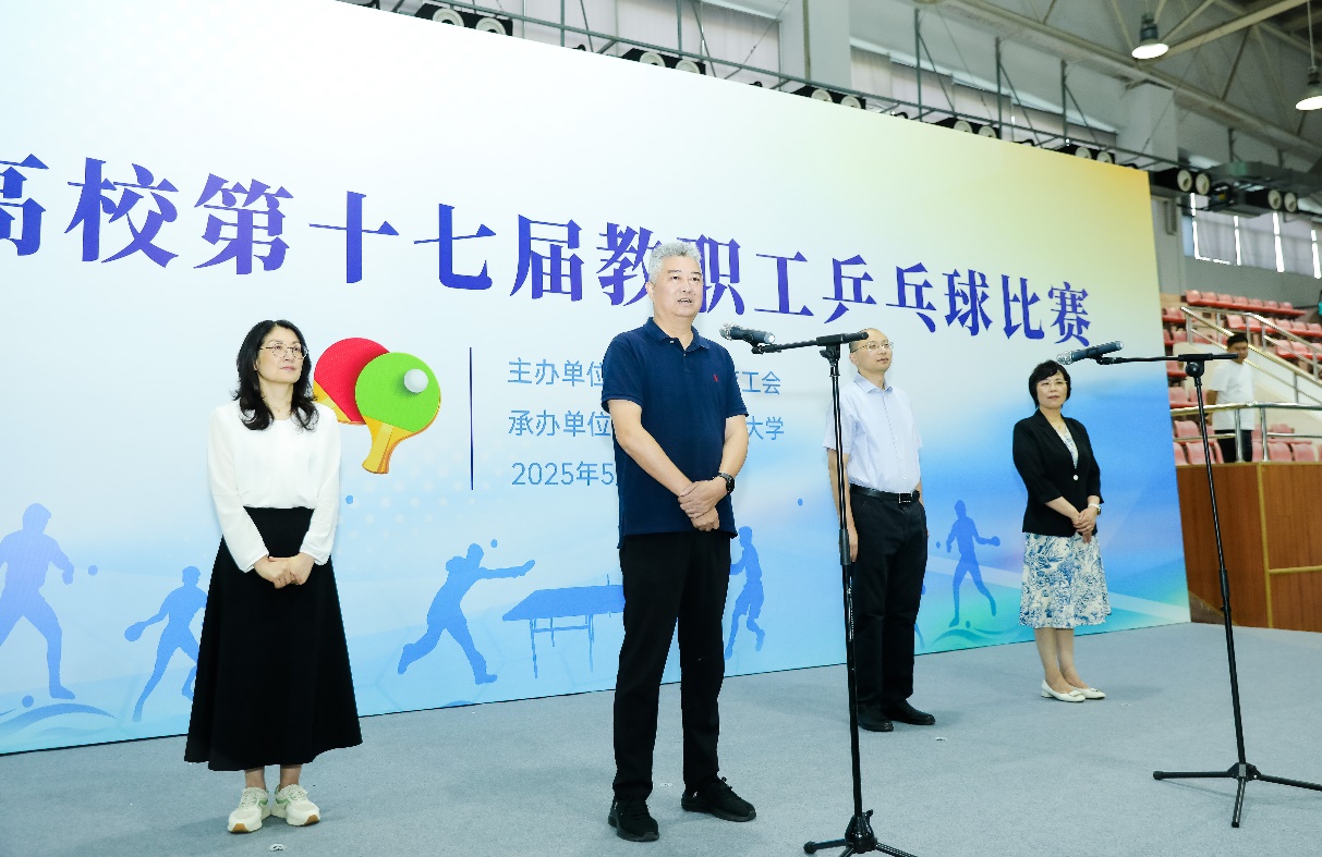苏州市教育工会主席汪涛致开幕辞。他指出,在2025年多哈世界乒乓球锦标赛鸣金收兵之际,一年一度的在苏教职工乒乓球团体赛拉开战幕,乒乓球国球的地位使这项传统赛事堪称在苏片区各大学的“奥运盛会”!他希望此次赛事继续搭建起高校间文体沟通的桥梁,进一步贯彻落实好全民健身运动,丰富教职工业余文化生活,让乒乓运动凝练成的团结、拼搏、向上的体育精神,化作高校教师为党育人为国育才的强劲动力。裁判员代表、运动员代表宣誓完毕,汪涛主席宣布比赛正式开始。