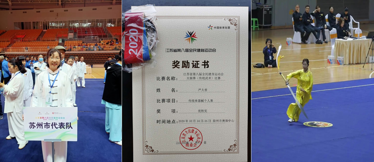 近期,协会又传喜讯。2020年10月,由江苏省全民健身运动会组委会主办,江苏省社会体育管理中心、江苏省体育彩票管理中心、江苏省武术运动协会、徐州市体育局、徐州市云龙区人民政府承办的江苏省第八届全民健身运动会太极拳(传统武术)比赛在徐州奥体中心开赛。苏州大学太极拳协会常务副会长严大香老师代表苏州市参加了本次比赛,并在女子传统武术单器械中获得第一名,展示了一幅最美丽的武术健身画卷。