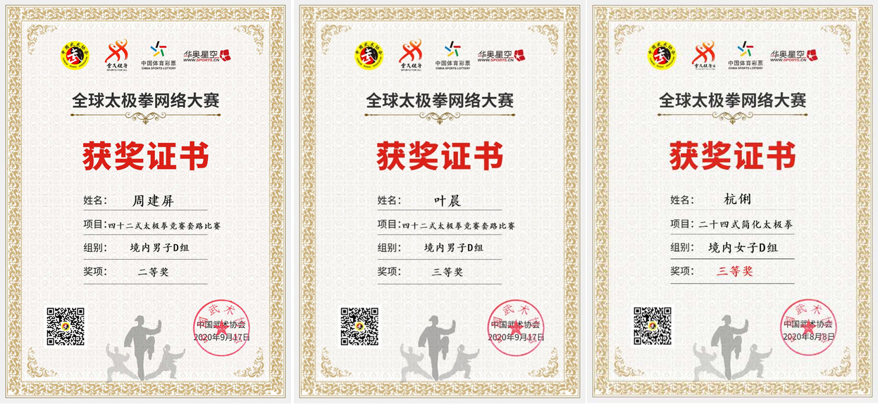 在协会严大香老师的认真辅导下,教职工积极备战、认真参赛,从配备服装、选定音乐,再到视频录制,都做了精心准备,充分展现了我校教职工良好的精神风貌和太极拳演练水平。最终,周建屏老师获得四十二式太极拳竞赛套路二等奖,叶晨老师获得四十二式太极拳竞赛套路三等奖,杭俐老师获得二十四式简化太极拳三等奖。