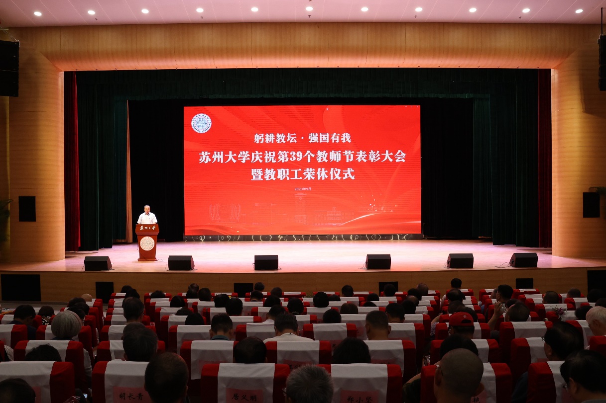 在第39个教师节来临之际,我校举行系列活动庆祝教师节。9月8日下午,苏州大学庆祝第39个教师节表彰大会暨教职工荣休仪式在天赐庄校区存菊堂举行。校党委副书记、校长张晓宏,在校校领导,部分院士,“高尚师德奖教金”获奖教师,荣休教职工以及工作满30年的教职工代表,各学院(部)、部门、直属单位主要负责人,教职工代表,学生代表参加了会议。会议由校党委常委、副校长姚建林主持。