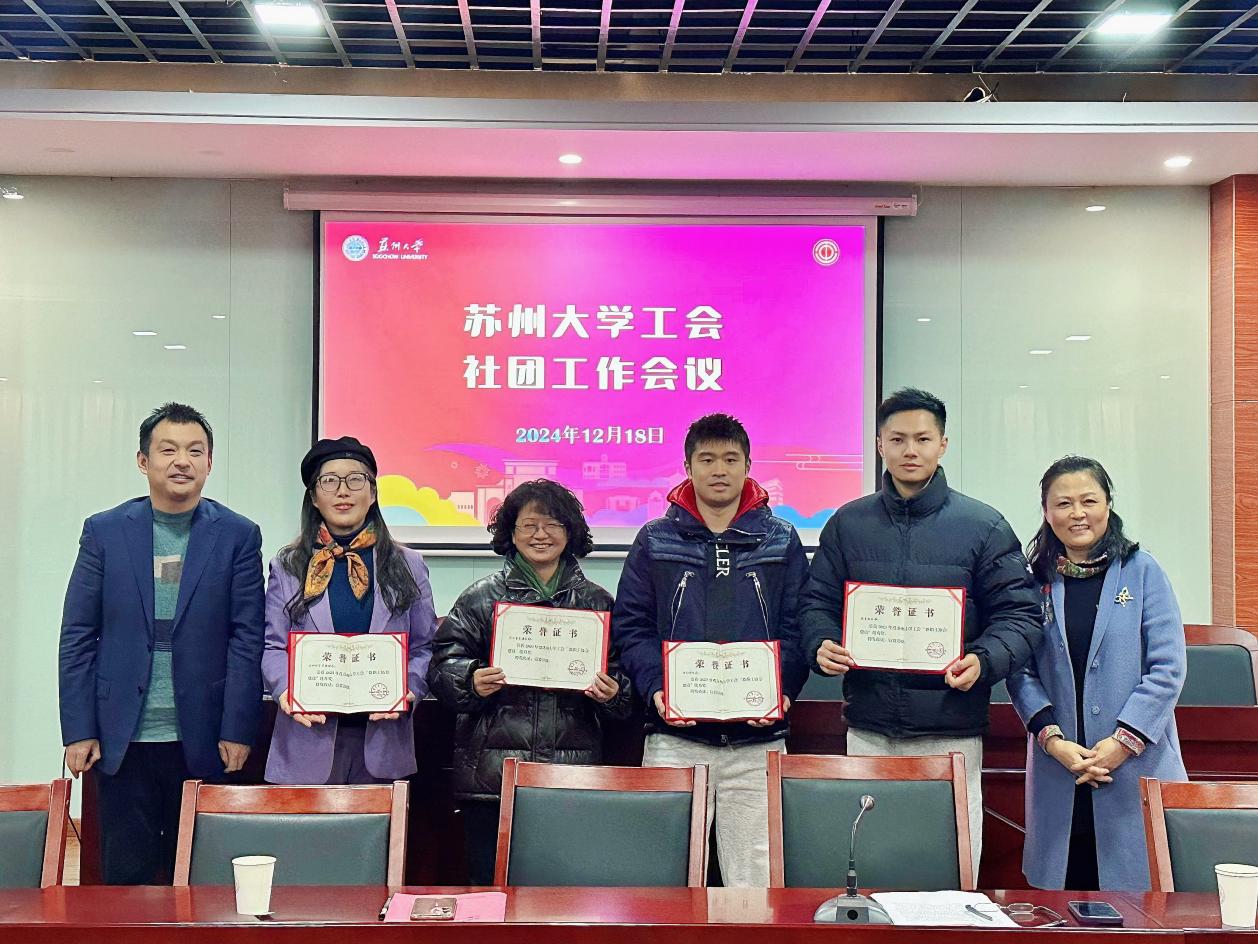 最后顾志勇、陈洁为获得2023年度苏州大学工会“教职工协会建设”优秀奖的女知识分子联谊会、职工园艺俱乐部、羽毛球协会、健身俱乐部颁发了荣誉证书。