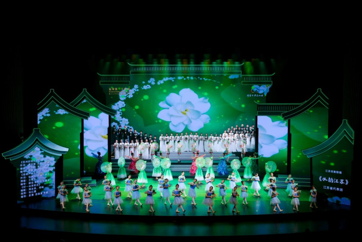 作为江苏省代表团,苏州大学沙优教师合唱团携手常熟市木兰拳协会、苏州市吴韵少年艺术团和舞蹈团等多个艺术团,参演最后的压轴曲目——江苏民歌联唱《水韵江苏》。一方水土滋润一方民歌,江苏民歌既有江南的妩媚,也有江北的爽朗,“苏州好风光”“拔根芦柴花”与“好一朵茉莉花”相映成辉,展现出芬芳美丽、英才荟萃的锦绣江苏风采。