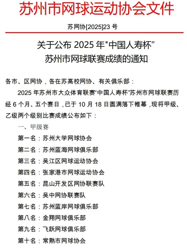 10月18日,由苏州市体育局、苏州市体育总会主办,苏州市网球协会承办的2025年苏州市大众体育联赛“中国人寿杯”苏州市网球联赛圆满收官。作为苏州市最大规模的大众网球赛事,吸引了全市各地21支队伍500余名选手参加比赛。