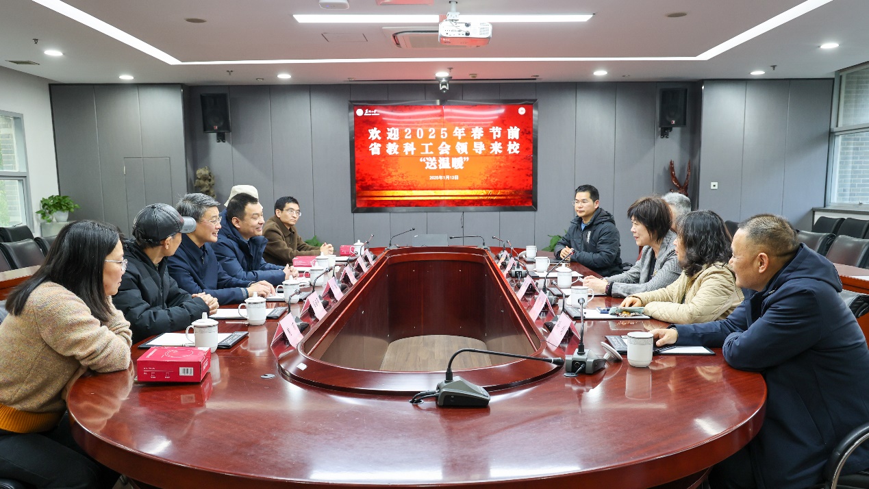 1月13日下午,江苏省教育科技工会主席、省总工会一级巡视员寇芳来我校开展“工会常伴·贴心送暖”慰问活动。我校党委副书记邓敏,省教育科技工会高校部部长孙剑,苏州市总工会副主席俞靖、权益部副部长彭建国,苏州市教育工会主席汪涛,校工会副主席(主持工作)顾志勇,4名教职工代表参加活动。
