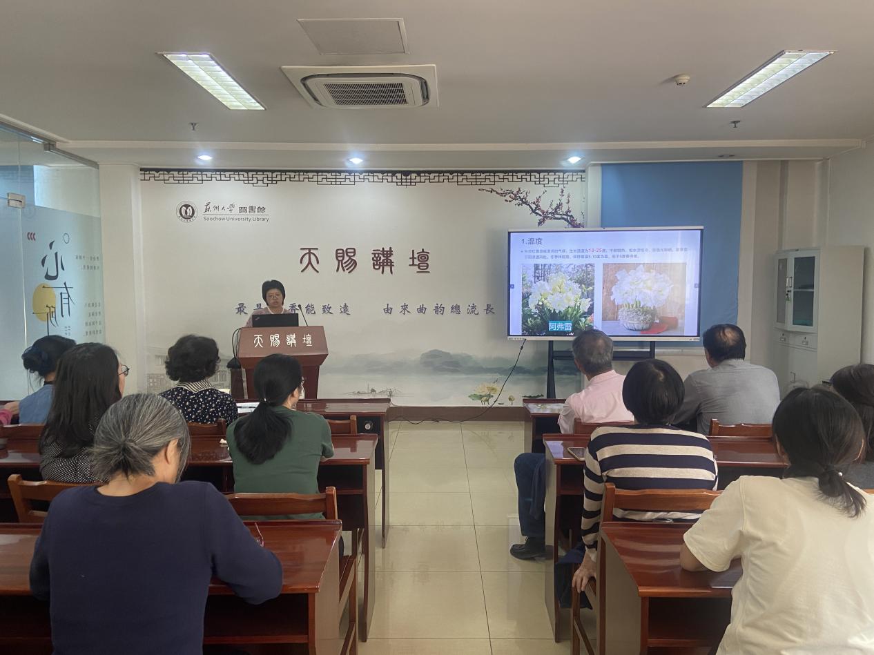 2023年10月27日下午,苏州大学教职工园艺俱乐部线下活动 “球茎悦读”在苏大本部图书馆通识教育基地举行。作为今年俱乐部第一次较大规模的线下活动,得到了校工会和图书馆的大力支持。校工会赵石言、吴扬老师以及教职工园艺俱乐部会员等30余人参加了本次活动。