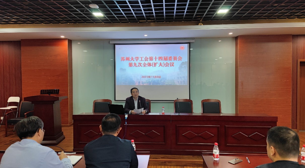 2023年11月8日下午,苏州大学工会第十四届委员会第九次全体(扩大)会议在东校区教工活动中心会议室召开,校十四届工会委员会委员、经费审查委员会委员,各分工会主席参加了会议。