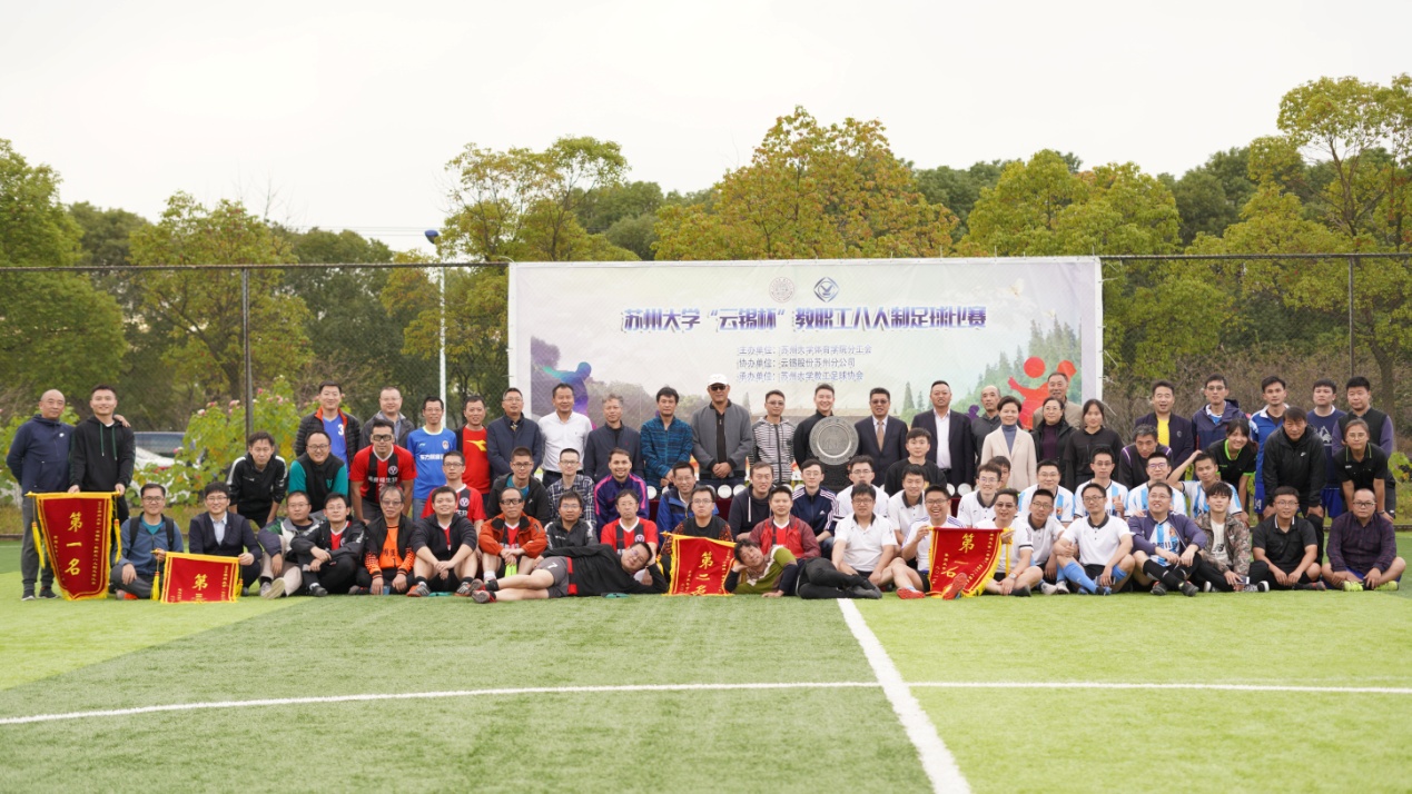 11月23日,为期近两个月的苏州大学“云锡杯”足球邀请赛顺利完成了所有赛程,在独墅湖校区一期足球场胜利闭幕。苏州大学工会副主席陆伟中,云南锡业股份有限公司苏州分公司总经理秦凯、昆山锡材有限公司总经理李云、上海投资发展有限公司总经理周勇,校教工足球协会名誉会长王安列,轨道交通学院党委副书记、副院长黄晓辉,体育学院公体部主任陈忠宇、副主任陆文龙,校教工足球协会秘书长吕多新等嘉宾到场并为取得名次的队伍颁奖。
