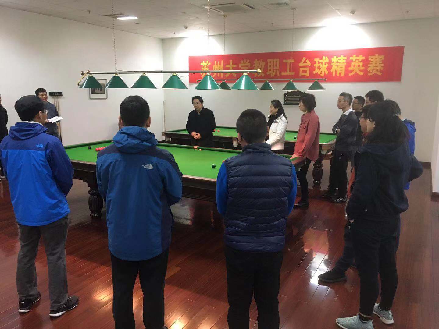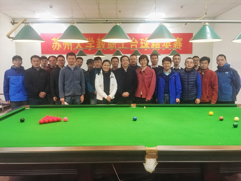 2019年12月1日,由苏州大学工会主办、校教工台球协会承办、教育学院分工会协办的“2019苏州大学教工斯诺克台球邀请赛”在独墅湖校区教工活动中心台球室开幕。开幕式由教工台球协会会长丁威主持,校工会主席王永山、副主席陈洁到场祝贺并讲话,教育学院党委书记赵阳出席了开幕式。