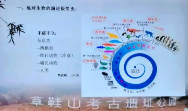 卢亮老师介绍说,地球上的生物在演进中经历五次大灭绝,无数物种彻底消失。哺乳类动物生存与发展慢慢演进迎来新生代。在这新生代中约240万年前,哺乳类生物才向直立人时代演进,大脑容积变大了,腿变长了。类人猿向人类的进化有了质的变化。约20万年以前,智人在非洲突然产生。他们的智力大大进化。约6万年前智人开始第二次走出非洲,有一支经过海湾地区、印度、再到东南亚,从南向北来到中国。4000年前(夏朝开始)是新石器时代,这段时间是无文字记录的,主要由考古来解决。3000年前(周朝开始)是青铜器时代,之后进入有文字可考时代。