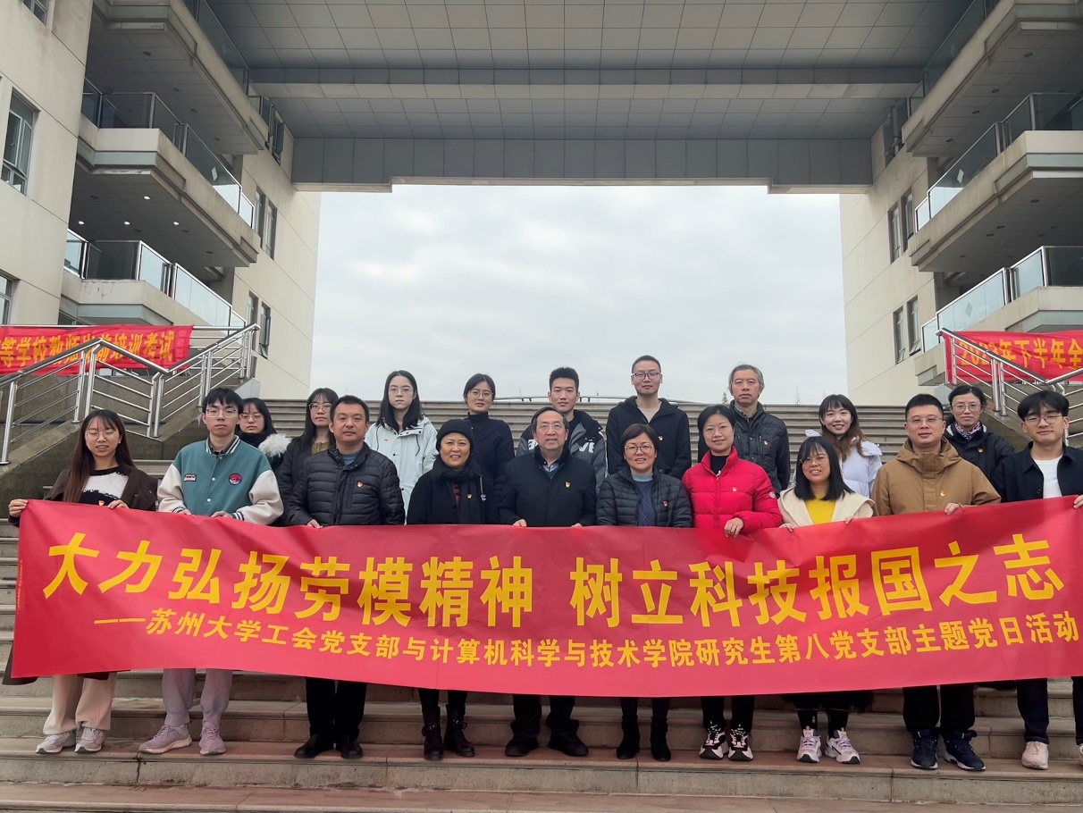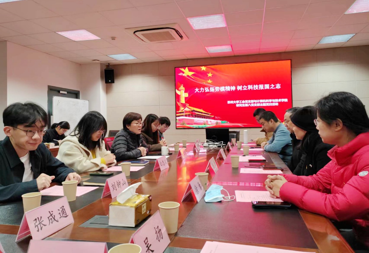 为进一步创新思想政治工作,推进“三全育人”,努力培养担当民族复兴大任的时代新人,踔厉奋发,笃行不怠,引领师生踏上实现强国建设、民族复兴的新征程。12月13日上午,苏州大学工会党支部和计算机科学与技术学院研究生第八党支部在理工楼211会议室开展“大力弘扬劳模精神 树立科技报国之志”主题党日活动。苏州大学工会主席、党支部书记王永山,副主席陈洁,工会副主席、党支部副书记顾志勇,计算机科学与技术学院研究生辅导员白志凤,及两个支部的支部委员、教职工党员和学生党员代表出席会议。会议由计算机科学与技术学院党委副书记、副院长李恩秀主持。
