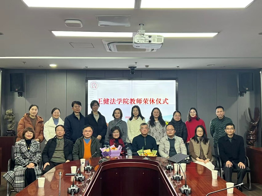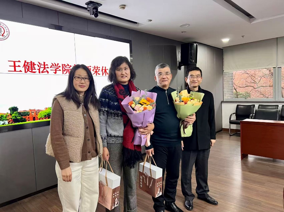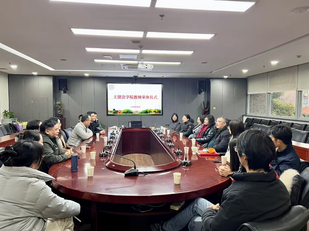 1月5日下午,王健法学院2025年度教师荣休仪式在法学院B201会议室举行。学院荣休教师杨军、殷雁鸣,学院教职工代表参加了本次座谈。学院分工会主席张鹏教授主持仪式。