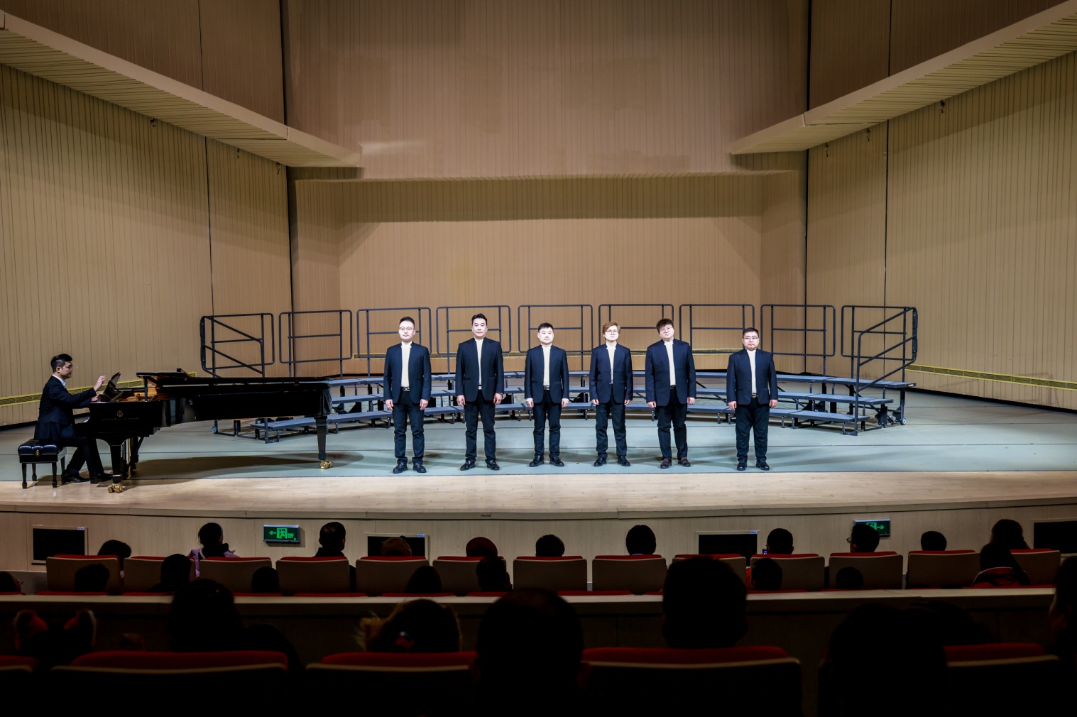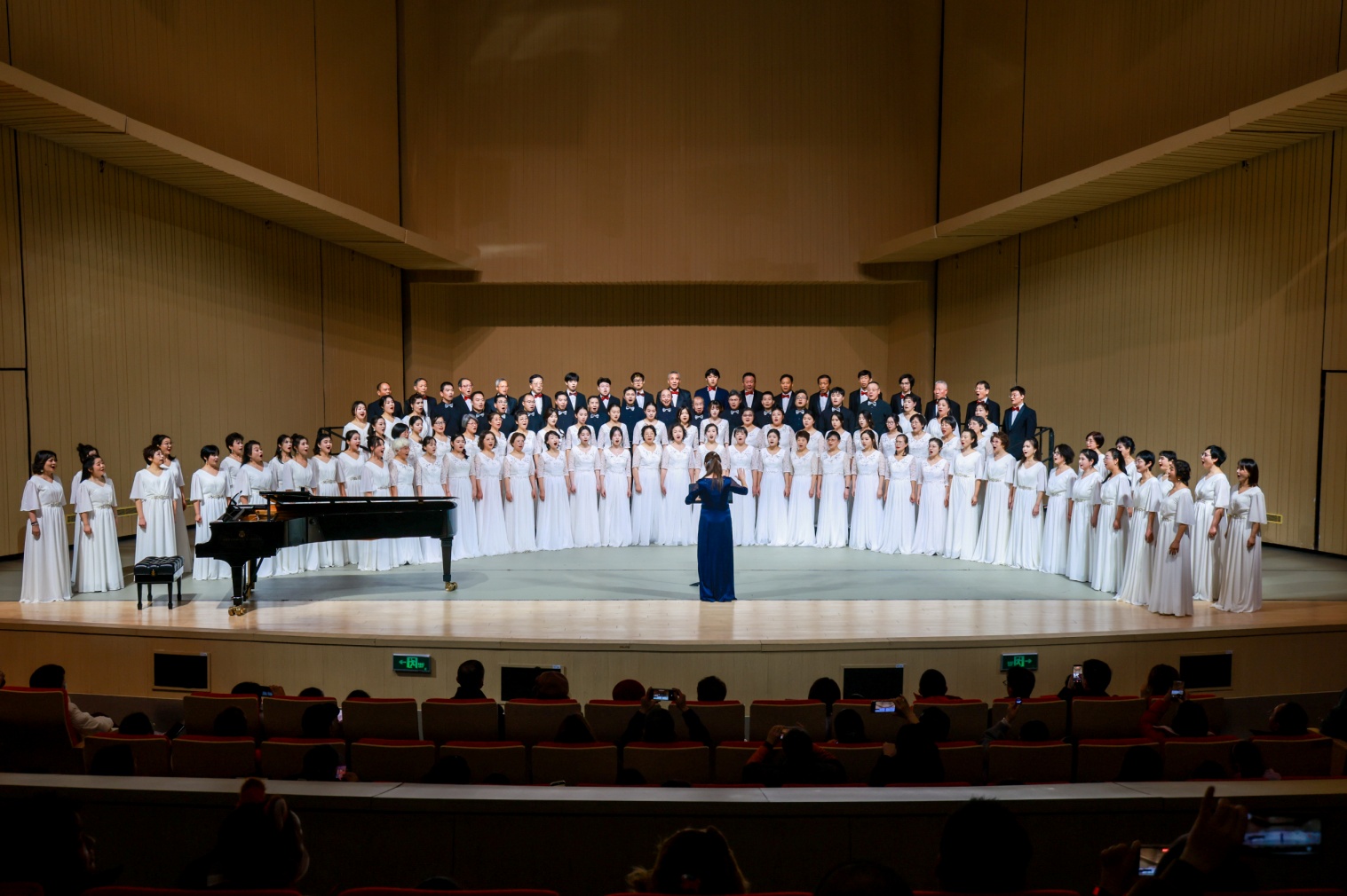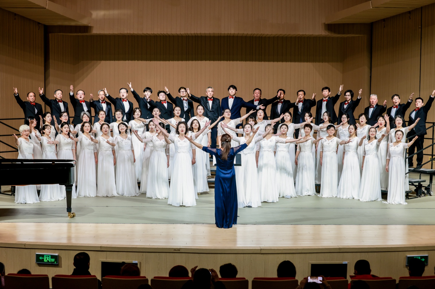 最后是四个合唱团同台放歌《我歌唱的理由有很多》《我的祖国》,由张红霞教授担任指挥,王雅南担任钢琴艺术指导,欢快的旋律、优美的曲调、演员们与观众的热情互动,引得台下观众的阵阵掌声和欢呼声,将整场音乐会推向高潮。