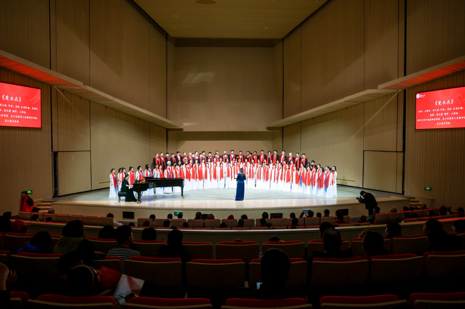 全场的压轴曲目《爱永在》由苏州大学沙优教师合唱团携手吴江区教育工会教师合唱团共同演绎。作为民族歌剧《沂蒙山》的核心咏叹调,该曲目以朴素而充满诗意的歌词,搭配动听的旋律,展示军民情感,赞颂国家和民族,表达深沉而真挚的情感,深深地震撼着心灵。