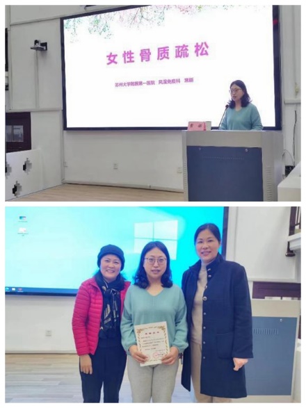 苏州大学附属第一医院风湿免疫科常新副教授,在讲座中呼吁女性们关注并防范骨质疏松的潜在风险;通过通俗易懂的讲解,阐述了骨质疏松的危害以及维持健康的相关手段;在互动对话环节,针对观众提出的健康问题,进行细致解答,以医学专业知识为女性健康保驾护航。健康知识讲座反响热烈,党工委常青伟副书记、工会副主席陈洁为常新教授颁发感谢证书。