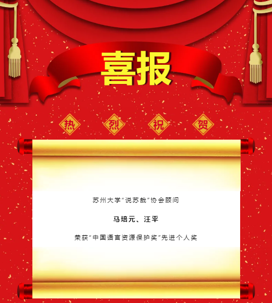 热烈祝贺苏州大学说苏哉协会顾问马培元、汪平荣获“中国语言资源保护奖”先进个人奖。