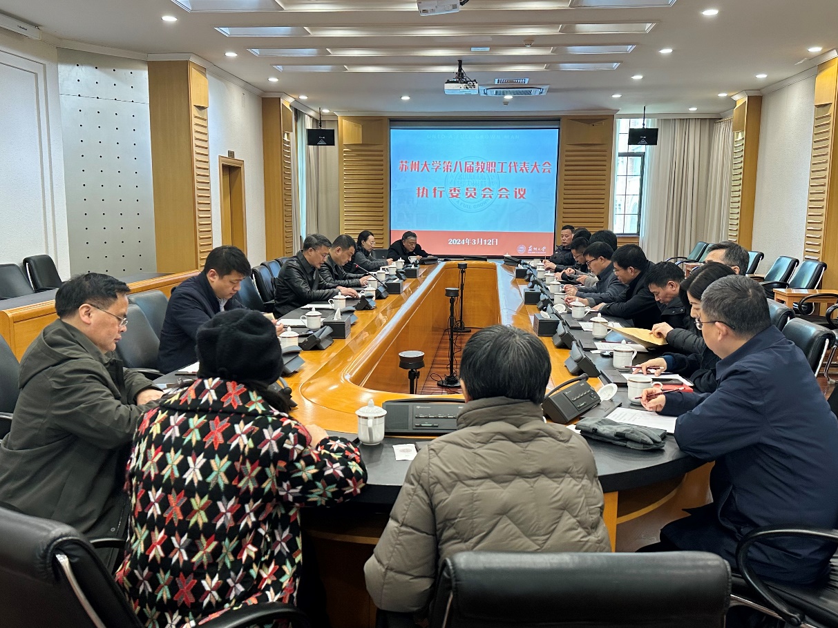 2024年3月12日上午,苏州大学第八届教职工代表大会执行委员会第六次全体会议在红楼217会议室召开。会议由校党委副书记、教代会执委会主任邓敏主持,全体执委会委员出席了会议,校工会副主席、执委会秘书处有关同志列席了本次会议。