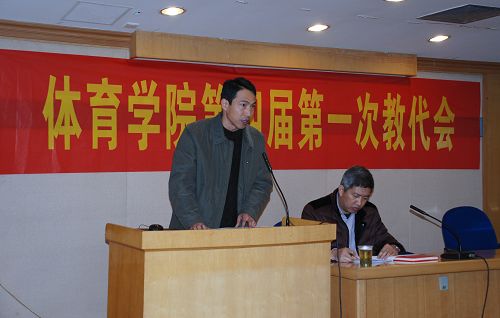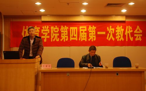 体育学院四届一次教代会于2014年1月3日下午13:00在凌云楼902召开。应到代表49名,实到46名,特邀代表3名,列席代表1名。校长助理、校工会主席、退休协会负责人应邀出席了会议,系部主任及博导列席了会议。校长助理王家宏同志和校工会主席王安列同志发表了热情洋溢的讲话,充分肯定了体育学院这一年来所取得的各项成绩,同时提出了更高的要求和希望。