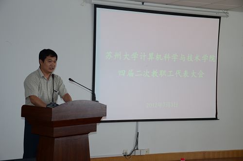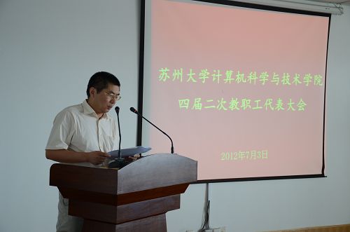 2012年7月3日下午,苏州大学计算机科学与技术学院四届二次教职工代表大会在理工楼504召开,学院55名正式代表参加会议。大会主要议题是审议并表决学院“绩效及奖励分配管理条例”、“岗位聘用和考核实施细则”、“奖励条例”等条例与附件。大会由院党委书记胡新华同志主持。