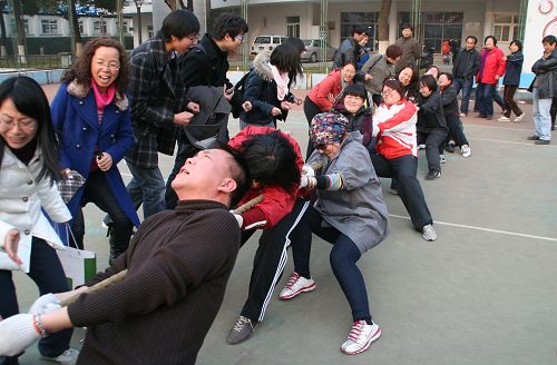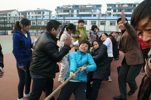 下午1:30分,开赛的第一个项目就是软式排球,采取25分一局淘汰赛。场上,各参赛队员的团队意识都很强,她们相互鼓励,默契配合,既赛出了风格,又赛出了友谊。跳大绳比赛是渗和在软式排球赛的空隙中进行的。跳大绳比赛规则是2人甩绳、5人同时跳,在2分钟的时间里以个数多的依次排名。当软式排球和跳大绳比赛结束后,最激烈、最热闹的场面就是拔河比赛了。拔河比赛每队10人。须有2名男士参与,其中必须有1名是院领导或者分工会主席。当裁判吹响开始的哨声时,“加油、加油!”的喊声响彻云霄,拉拉队员的干劲一点也不示弱;拔河队员更是咬紧牙关,屏住呼吸,在僵持30秒后决出胜负。