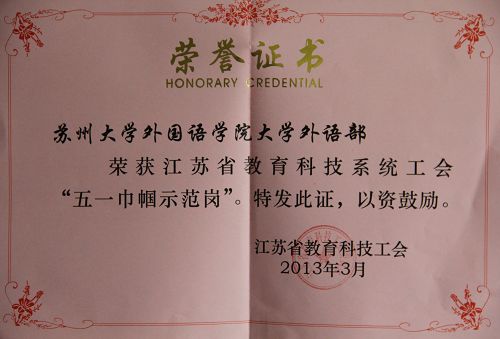 根据苏教科工[2013]12号《关于表彰江苏省教育科技系统“五一巾帼示范岗”、 “五一巾帼标兵”的决定》文件,我校外国语学院大学外语部荣获江苏省教育科技系统工会“五一巾帼示范岗”光荣称号,特向全校教职工报喜。
