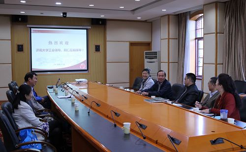 11月3日,济南大学工会同仁在工会主席孙玉堂的带领下来我校开展工作交流,我校工会主席王安列、工会副主席冒维东、陈洁及相关工会干部参加了交流活动。