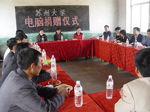 在海阳市教育局领导的安排下,4月27日上午9点30分,苏州大学捐赠电脑仪式在山东海阳市郭城镇第一小学举行,参加捐赠仪式的有校工会主席王安列,校办对外联络接待办公室副主任孙建娅及实验设备处的代表等一行4人。仪式由海阳市教育局邱副局长主持,在热情洋溢的气氛中进行。