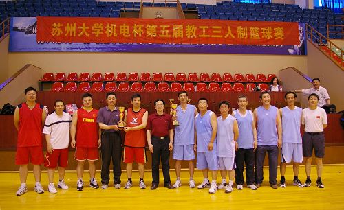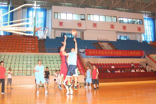 我校爱好篮球运动的教职工在繁忙的工作中又迎来了第五届教工三人制篮球赛。校第五届教工三人制篮球赛于6月5日和6月6日在东校区体育馆进行。本次比赛共有17个分工会的20支队伍、一百多名运动员参加。经过32场小组阶段和12场决赛阶段的激烈比拼,体育学院代表二队、体育学院代表一队、机关代表二队、教工篮球协会代表队分获一到四名。教服集团代表队、王健法学院代表队、纺织与服装工程学院代表队和机电工程学院代表队分获五到八名。