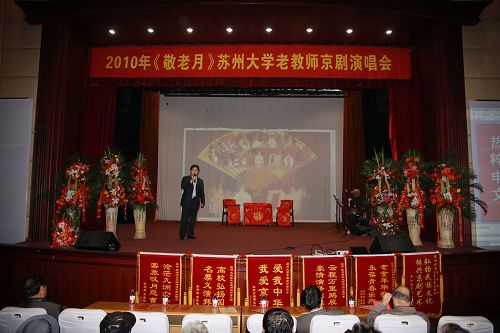 2010年11月24日下午1时30分,苏州大学校本部敬贤堂响起了京剧演唱会的开台锣鼓。整台演出共10个剧目,有4个清唱、4个彩唱和2个折子戏。我校京剧爱好者协会的老年朋友们,用了差不多半年时间,精心准备了一台京剧专场演出。在全国首次把重阳节的当月定名为“敬老月”之际,隆重推出了这次演出,并获得圆满成功。