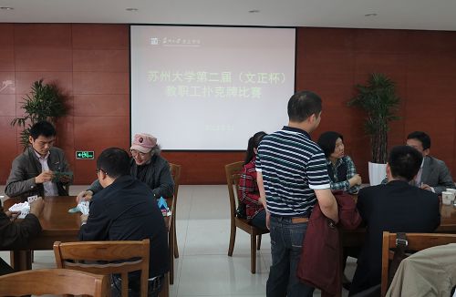 春风拂熙,山水秀媚,5月11日,苏州大学文正学院教工餐厅内笑语喧哗,气氛热烈,苏州大学第二届(文正杯)教职工扑克牌比赛正在这里隆重举行。