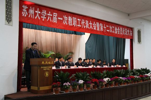 我校六届一次教职工代表大会暨第十二次工会会员代表大会于2010年3月5日—6日在东吴饭店大会堂召开。六届一次教职工代表和第十二次工会代表出席了会议,特别邀请了部分院士和全国政协委员、校各民主党派主委及侨台联组织、无党派知识分子联谊会、归国学者联谊会负责人,离休党工委负责同志,退休协会理事长、校学生会主席、校研究生会主席出席了会议,部分单位主要负责人、校工会委员、经审委员、分工会主席等列席了会议。会议由大会主席团主持。