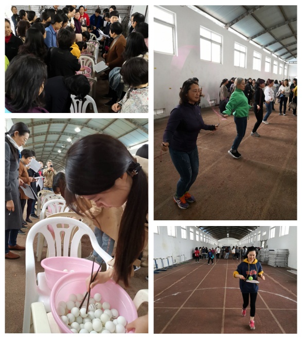对于各比赛项目女教工们驾轻就熟,很快进入角色。“筷夹乒乓球”是对手部力量及灵活度的考验;“跳绳”速度是第一,同时掌握好平衡;“踢毽子”的女教工们各显神通,右脚踢、左脚踢,侧踢,花式踢,摆出各种姿势,轻盈美丽;“齐头并进”主要锻炼腰腹部的力量和协调性,大家充分体验了紧张与欢乐、团结与默契。而“持球接力”则需心绪平稳,找准支点,避免掉球,大家用“走”,而不是“跑”,是对技巧与心理双重素质的考验。