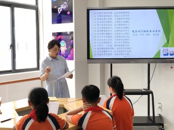 2020年6月18日下午苏州大学“说苏哉”协会副会长华莉老师在元和小学多功能教室,用地道的苏州话深入浅出地给该校的学生们介绍了“为什么要垃圾分类”以及“怎么进行垃圾分类”。华老师发现,小朋友们对于苏州推行垃圾分类的接受度很高,并且很乐意为垃圾分类的宣传尽自己的一份力。于是,华老师用苏州话童谣《伲苏州厾垃圾要分类哉》为小朋友们释义同时矫正读音,让小朋友们更好地在理解的基础上输出。最后,华老师还通过分组练习和小游戏巩固了这首新童谣,通过思考互动,每位小朋友们都能顺畅又标准地读出来。小朋友们个个热情高涨,纷纷表示要回家当好小老师,教会爷爷奶奶,把垃圾分类童谣传唱下去。
