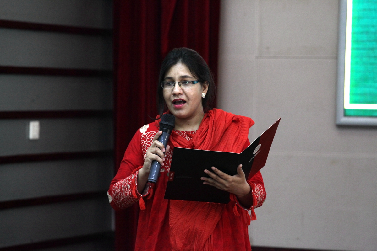 “杏林、红楼、后庄,那一张张笑脸,隐藏着此起彼伏的炊烟……”传媒学院许静波、冯洋合作朗诵的《天赐庄》,句句流露出对天赐庄的浓浓深情,令人动容。“当灿烂的太阳跳出东海的碧波,帕米尔高原依然是群星闪烁;当北国还是银装素裹的世界,南疆早已洋溢着盎然的春色。啊,我们爱你,中国!” 来自巴基斯坦的 Aisha Bibi 以一首现代诗《我们爱你啊,中国》赢得全场的阵阵掌声。赛前,Aisha Bibi 苦练了三天中文,用英语音标去记住每一个中文字的发音。她说,要用更好的朗诵表现来表达对中国的热爱和感谢。“尽管她的中文不如其他中国本土选手那么流利,但是她的刻苦努力的精神和饱含的深情,让人不禁感动。”演出后,观众给予了 Aisha 很高的评价。