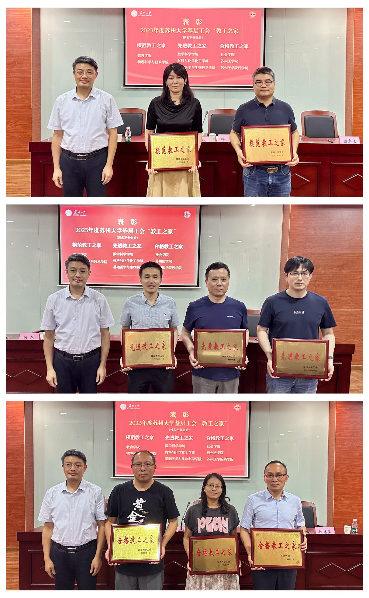 邓敏为2023年成功创建“模范教工之家”“先进教工之家”“合格教工之家”的基层工会授牌,为荣获表彰的2023年度二级教代会建设先进单位、2021—2022年度工会工作先进集体颁奖并合影留念。