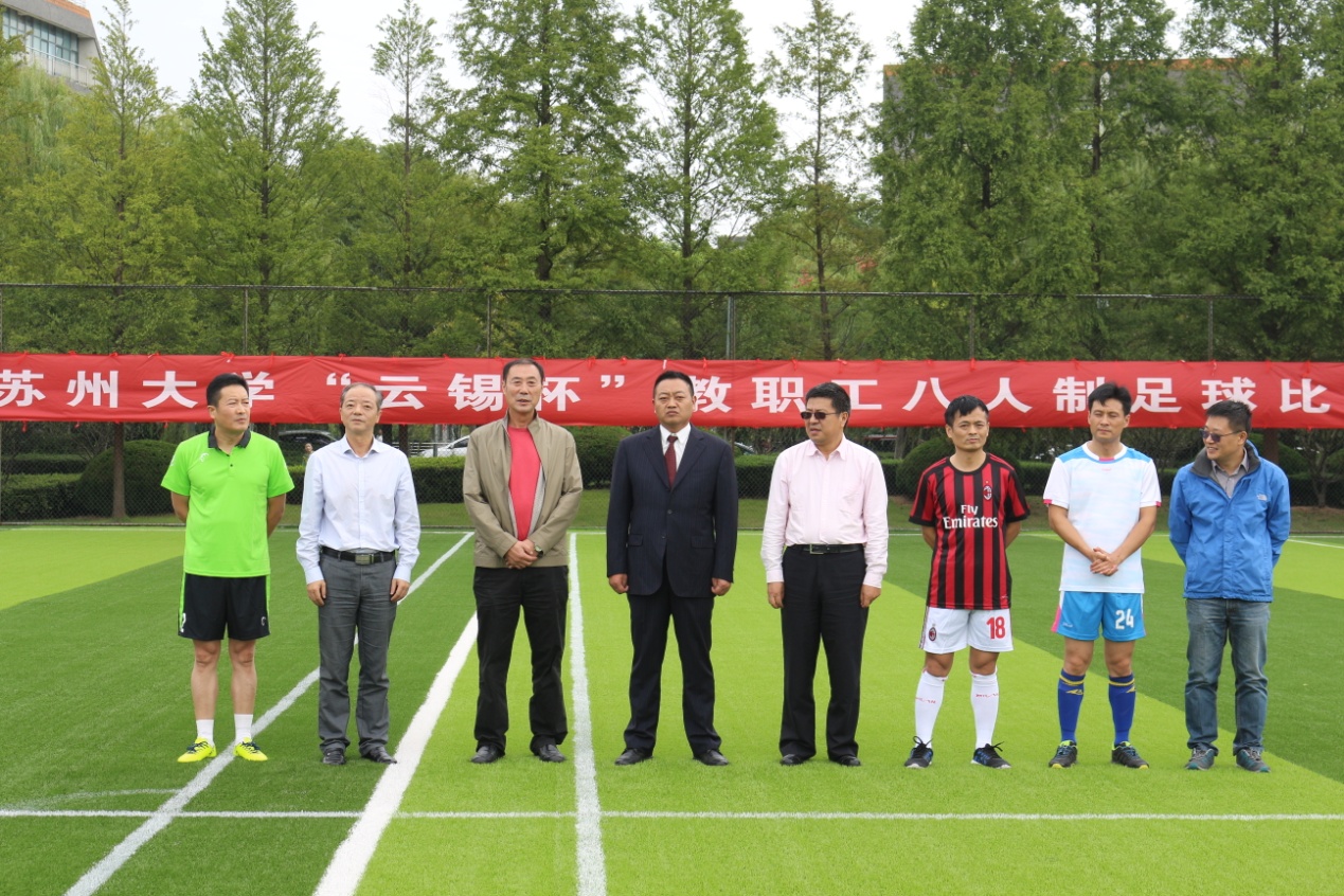 10月14日,苏州大学“云锡杯”教职工八人制足球比赛在我校独墅湖校区足球场开幕。本次比赛旨在为教职工们提供一个锻炼身体的平台,在友好的氛围中切磋球技、增进感情,有来自各学院、部门的16支代表队,百余名教职工参加了比赛。校工会主席王安列、校工会副主席冒维东、陈洁,云南锡业股份有限公司苏州分公司总经理秦慨、云锡公司代表李云,材化部党委书记、苏州大学教工足球协会会长李翔,教育学院院长冯成志,艺术学院副院长顾德学,轨道学院党委副书记、副院长黄晓辉,以及裁判员、各参赛队队员出席了本次开幕式。开幕式由校工会副主席陈洁主持。