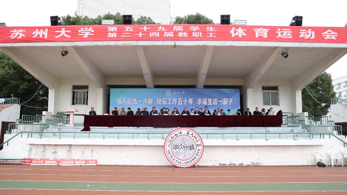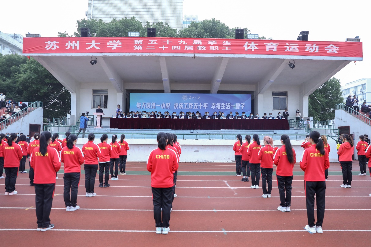 11月11日上午,苏州大学第五十九届学生、第二十四届教职工体育运动会在天赐庄校区东区运动场上举行。校领导江涌、张晓宏、邓敏、姚建林、宫向阳、李孝峰、査佐明、洪晔、吴嘉炜,江苏省学生体协高校工作委员会主任王家宏,以及各学院(部)和各职能部门主要负责人出席本次运动会开幕式。运动会开幕式由校党委副书记邓敏主持。