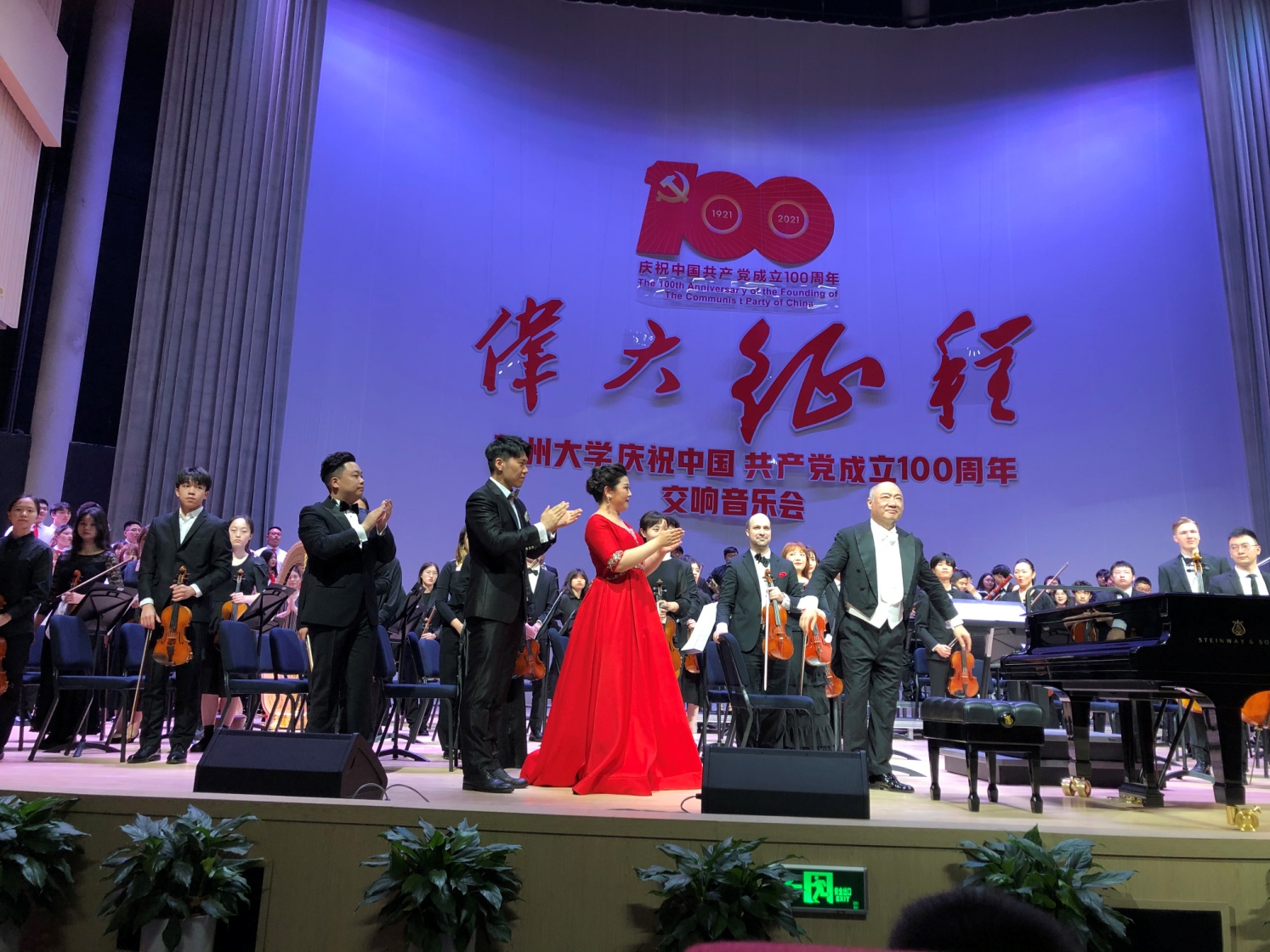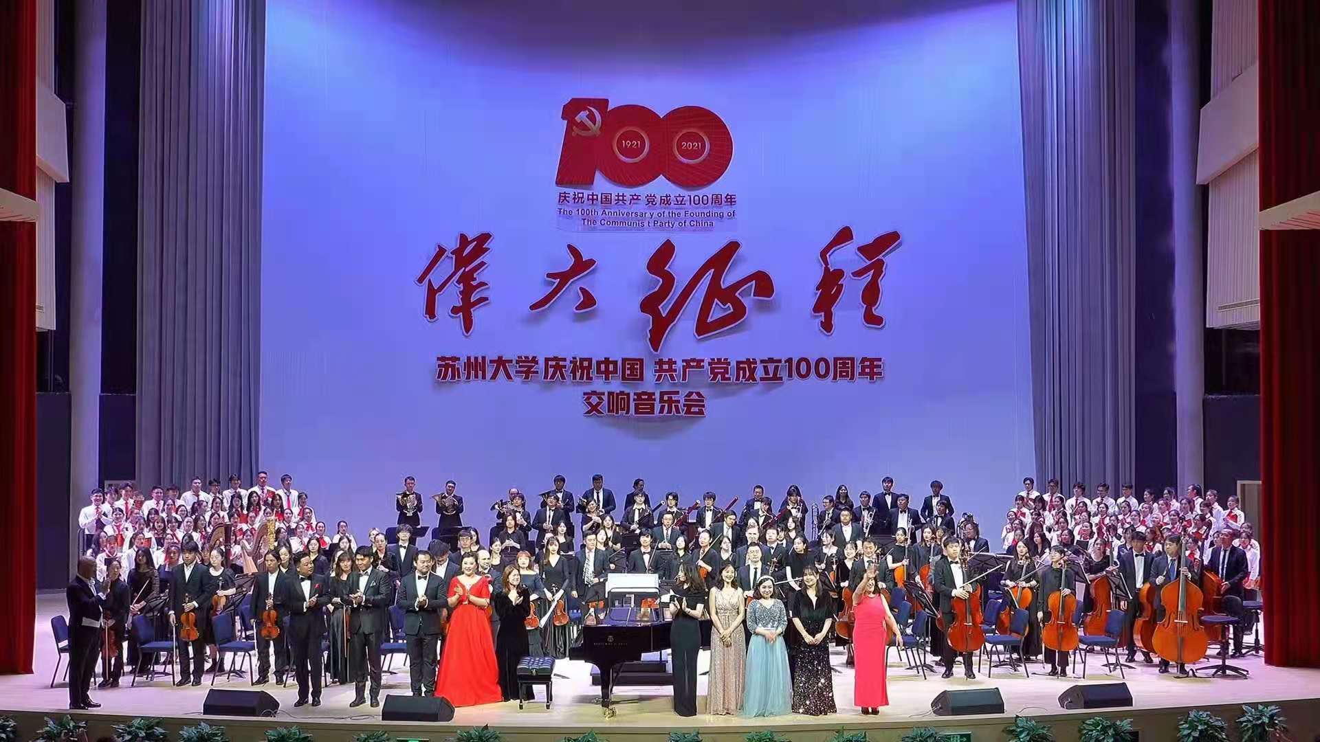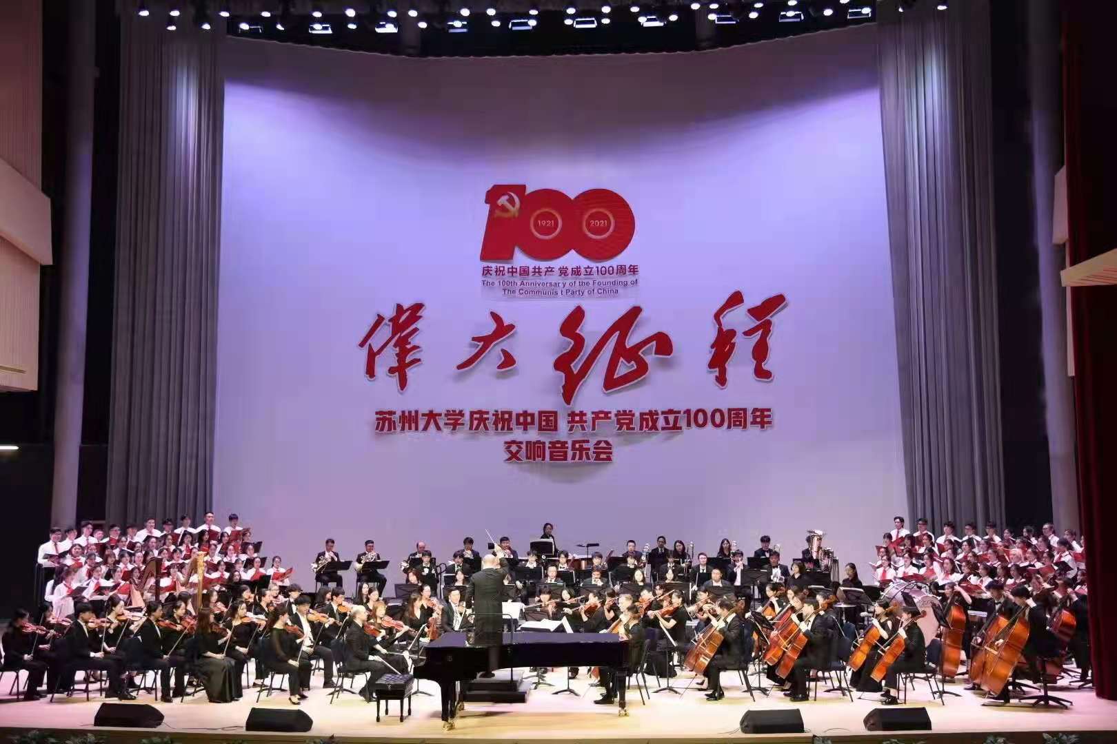 为庆祝中国共产党成立100周年,苏州大学交响乐团于2021年6月28日晚上7:30,在苏州大学独墅湖校区恩玲音乐艺术中心隆重举行“伟大征程——苏州大学庆祝中国共产党成立100周年交响音乐会”, 苏大沙优教师合唱团的团员及全场近千名观众共同欣赏了本场演出。